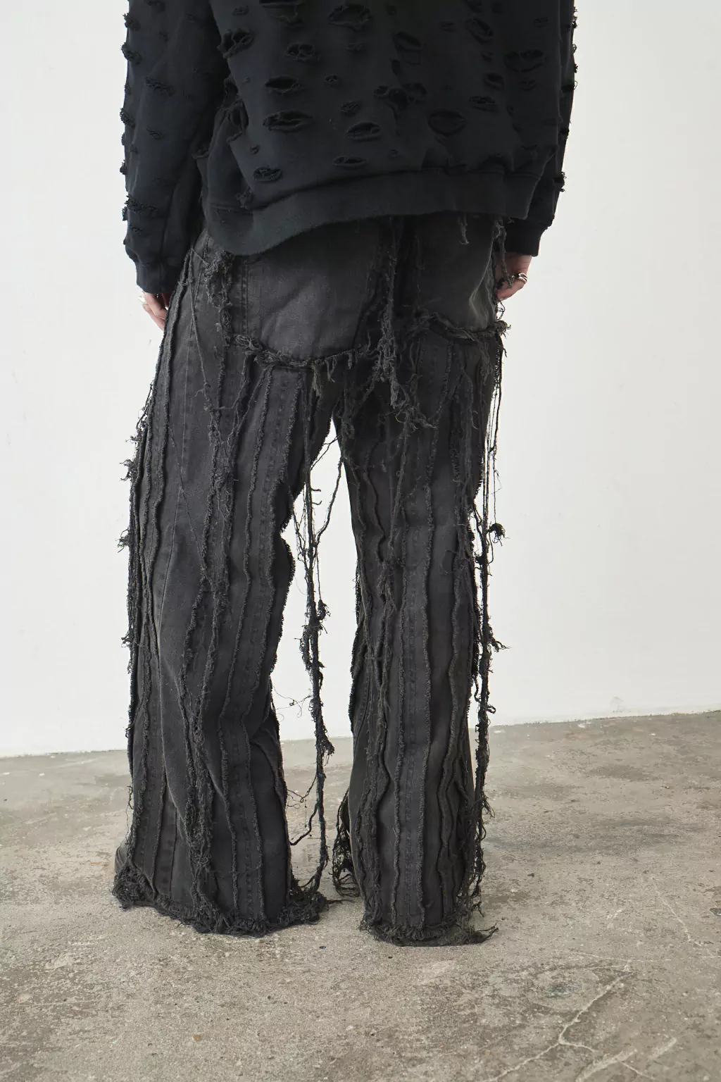 Pantalón de Jean rígido con tiras desilachadas. Tiro medio y de pierna ancha.