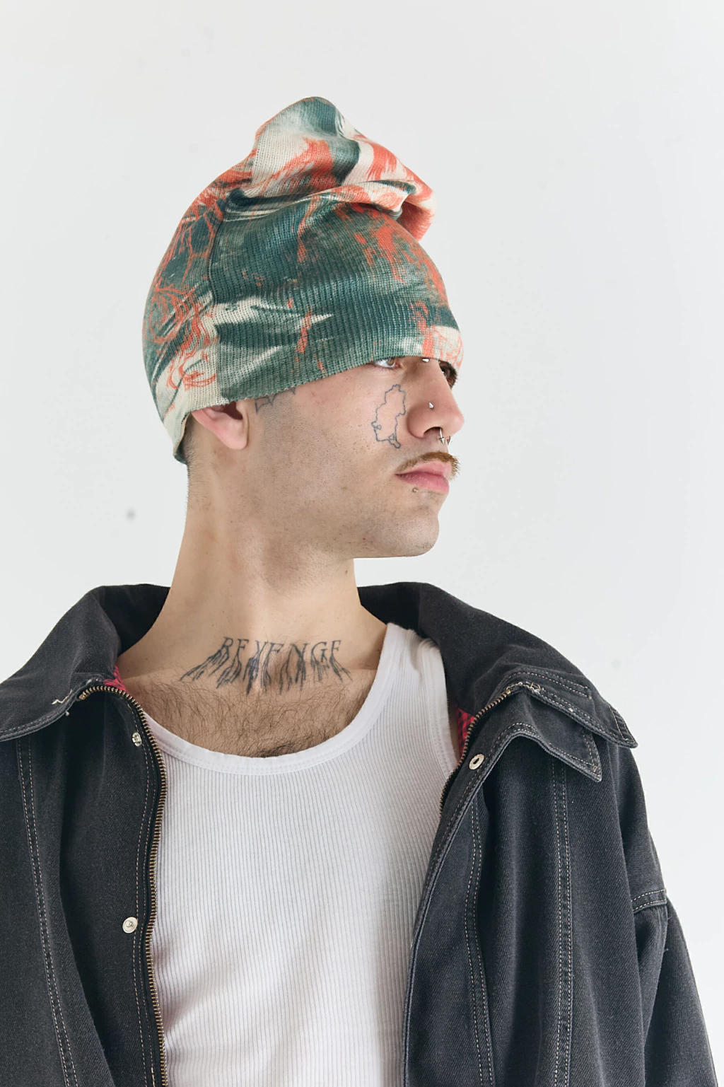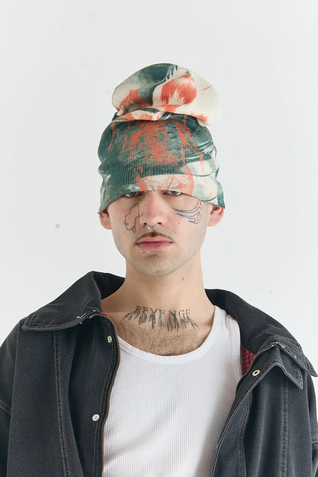 [ Gorro tipo beanie tejido estampado. Cuatro estampas diferentes distribuidas entre la parte delanera, trasera y el interior. ]