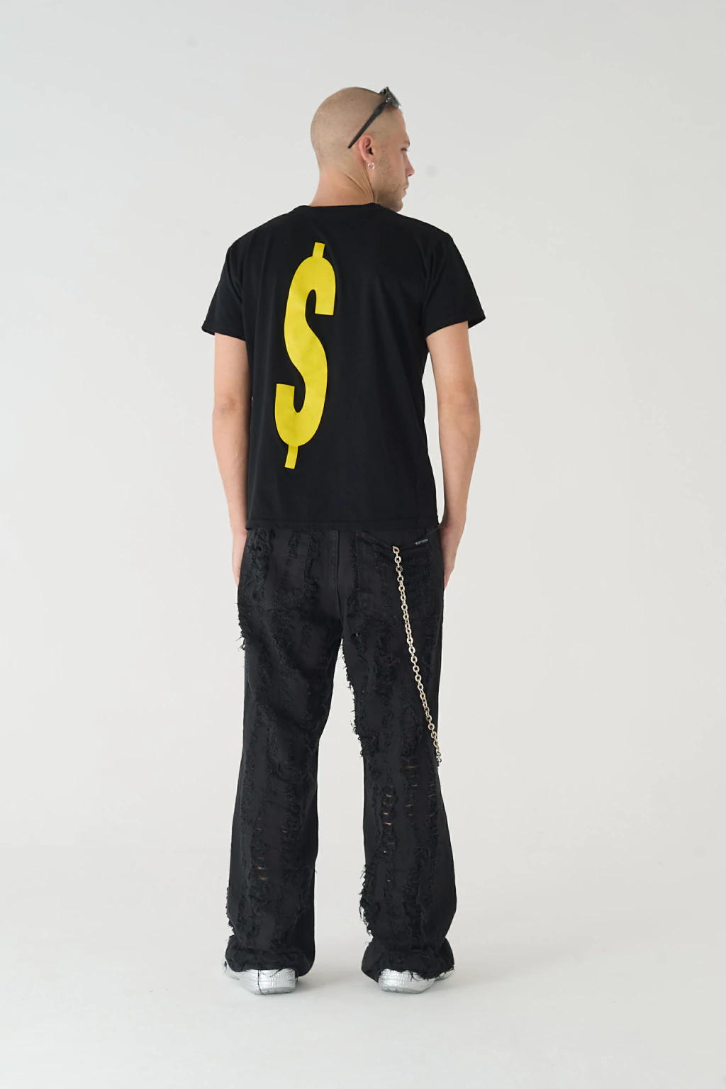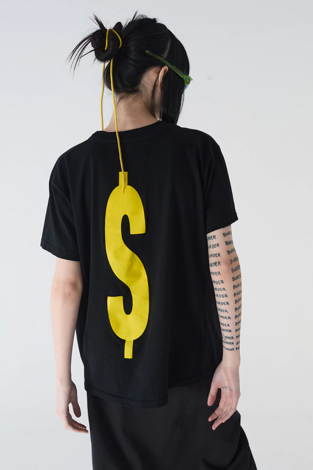 [ Remera de jersey negra manga corta con estampa “MONEYFESTING” en el frente y símbolo “$” en la espalda. Ambos en color amarillo. ]